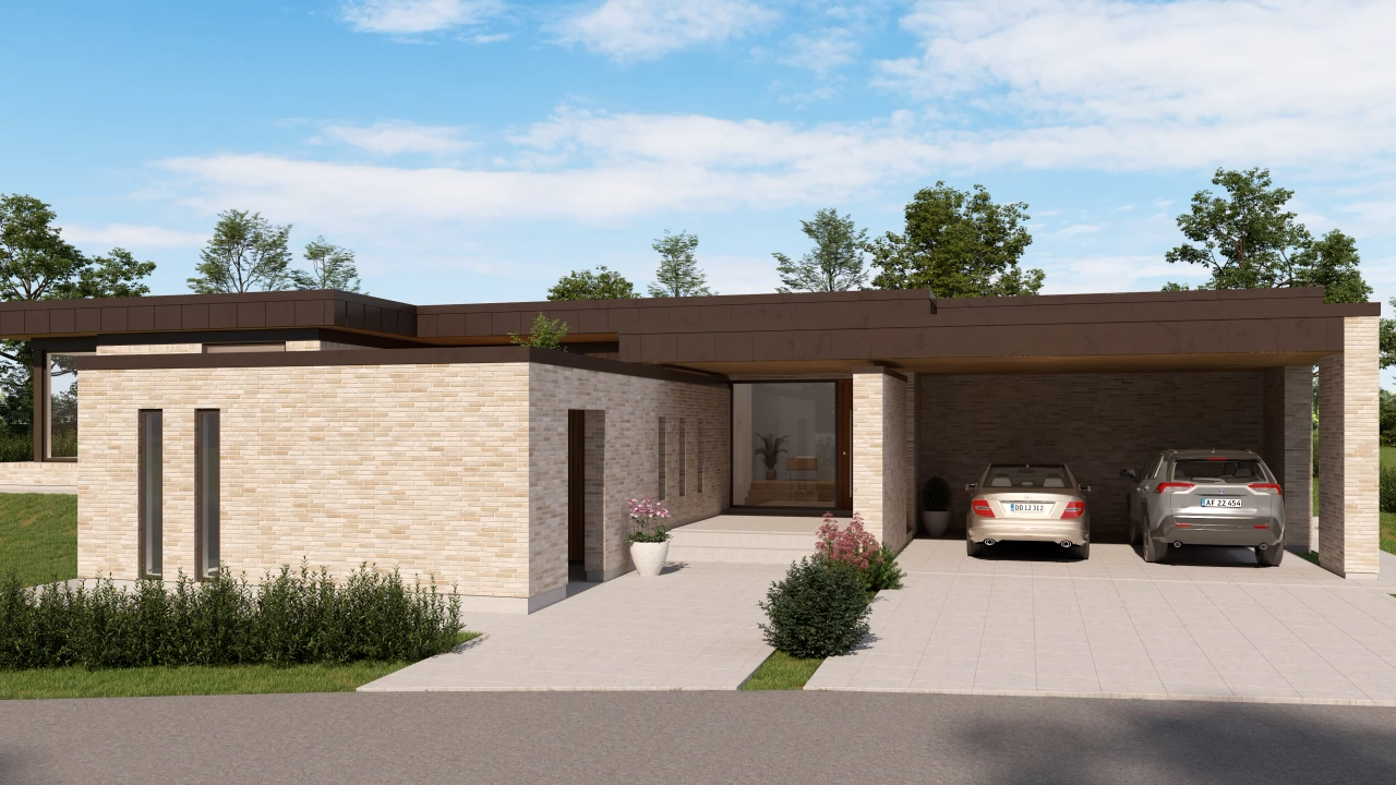 Ankomsten er tilbagetrukket og overdækket med direkte adgang fra carporten. En smuk egetræsdør fra Vahle leder ind i en niveauforskudt entré, der fordeler adgangen til boligens to fløje. Værelserne er samlet i højre fløj, mens køkken-alrum og stue ligger til venstre. Køkkenet er rummeligt med fritstående ø, et åbent depot med kaffeniche samt direkte adgang til de to terrasser. Stuen ligger let forskudt og er indrettet med indbygget reol, vinduesbænk med integreret opbevaring og et hjørnevindue, der forstærker forbindelsen til uderummet. Læg mærke til, hvordan vinduet er trukket ind fra facaden, så der opstår en muret bænk udvendigt.